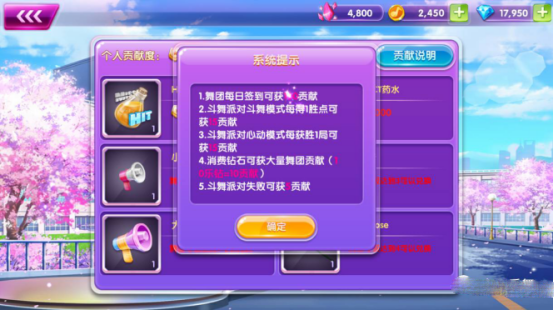 舞团中的玩家可以通过进行游戏签到等方式增加舞团贡献度,贡献度可以在舞团专有商店兑换道具物品。