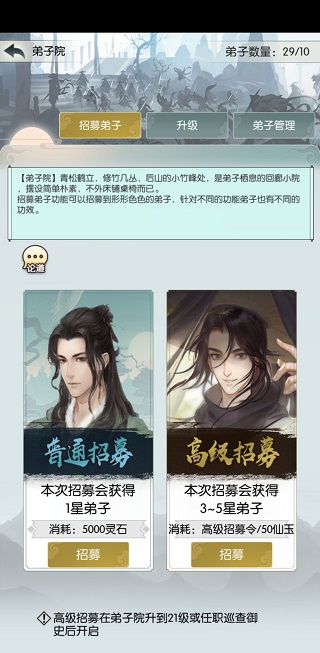 弟子院-从血脉上让你变强。弟子最高五星,每个四星以上弟子,都不要扔掉,有用的。越早拥有,等级越高。刚飞升就可以高级招募的御史大夫,会使你走在前面。有实力的,可考虑每日在暗金坊购买打折的高级弟子令,尽早使用。由于本游戏不会重复招募,平民玩家也可大幅度提升弟子院等级。举个栗子,假设你的弟子院达到40级,可招募弟子数量就很多了,3星弟子一共大概30个,都在你手,留一个位置招募,下一个招募的最低就是4星,5星几率也很大,根据弟子的天赋,派遣弟子去洞府加成,上阵增强实力,或者禁地搂钱。弟子少时,有些上阵弟子也能禁地的,可考虑下阵,先完成禁地。禁地上4名弟子时候,弟子很紧缺哦。