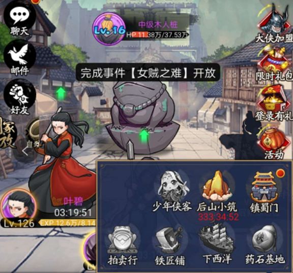 关于这个少年侠客玩法开启的方式,这边小编遇到了不少玩家的咨询,这边我就在这统一给大伙说下这个开启的流程吧。首先,需要先完成事件【女贼之难】点亮玩法图标,具体详情可看下下方图示。
