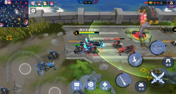 3、现在你就有三个攻击按钮啦,按补兵按钮会优先攻击范围内的小兵,按推塔按钮会优先攻击范围内的防御塔,想打什么就打什么!