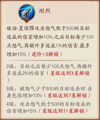 夏侯惇技能【刚烈】:被动,攻击怒气低于500的目标在成的伤害增加10%,之后目标每少100点怒气,再额外多造成1%的伤害,最多增加15%。