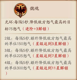 曹操技能【魏魂】:每隔5秒,降低对方怒气最高的目标75/150/225/300怒气。