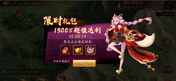 作为攻略就从开局说起吧,新手指引给两个橙将:公孙瓒祝融,打完第一个副本会给孟获的碎片,我建议把祝融换成孟获,孟获比较肉,前面和公孙瓒可以先用,然后通关第二关会有个6元礼包(必买),