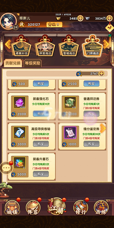 在门派中,玩家可通过每日签到或消灭门派boss来获得门派贡献,该代币可以在门派商店中兑换普通拜访券、高级寻侠券、装备升星石等物品。并且门派等级越高,在门派商店中还会增加永久限购物资。