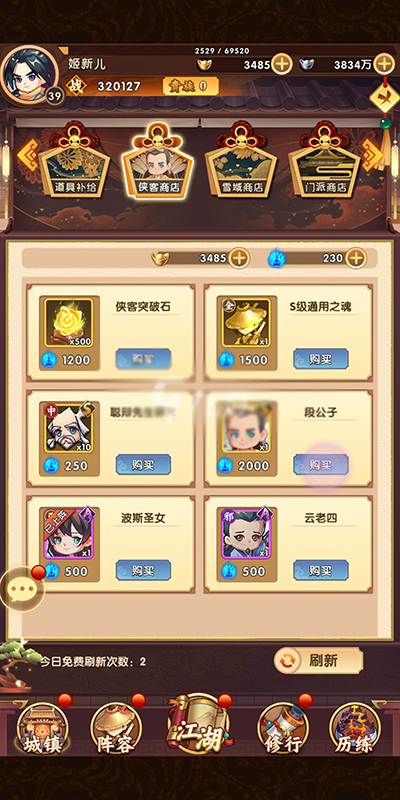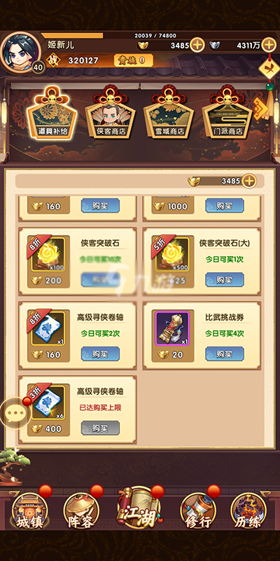 道具补给商店的货币是元宝,其中性价比最高的商品是400元宝/6个高级寻侠券,相当于节省了800元宝。该商店的其它商品则包括:侠客突破石、比武挑战券(擂台挑战道具)和装备强化石。