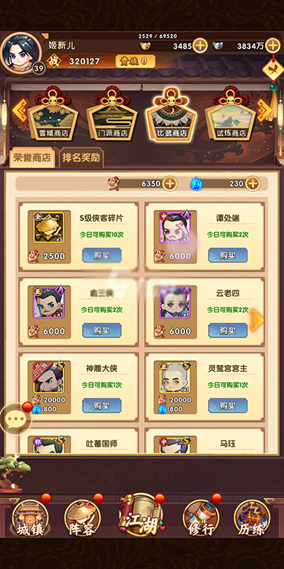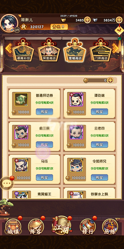 魔教雪域会依据通关的层数和消灭怪物的数量奖励积分,而积分可在雪域商店兑换的商品如下:普通拜访券(可兑换侠客碎片)-1w积分、紫色侠客-1w积分、橙色侠客-10w积分。请注意该商店的侠客都会每日刷新哦!