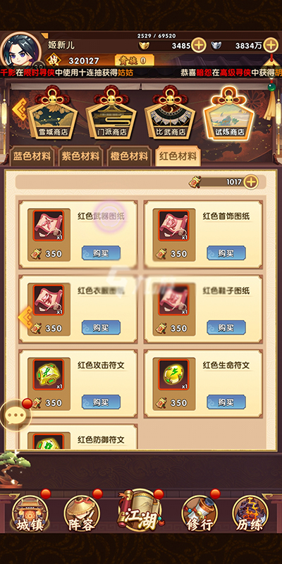 在试炼塔玩法中获得的试炼币可以在商店中兑换蓝色~红色品质的装备图纸和符文,具体价格如下,蓝色:40试炼币、紫色:80试炼币、橙色:150试炼币、红色:350试炼币。