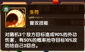 普攻技能:对随机3个地方目标造成90%的外功伤害,有50%的概率抢夺目标10%功放给自己2回合。