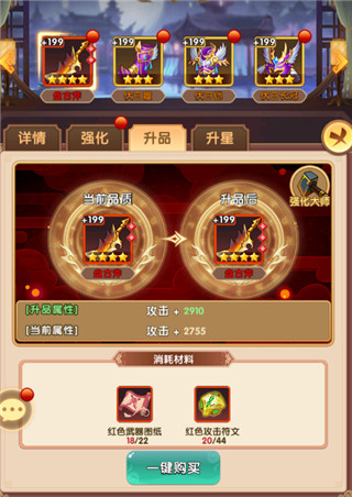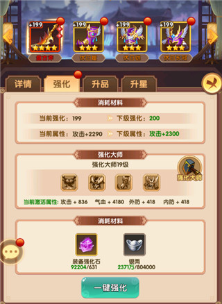 除了强化外,装备还可以通过升品来提升品质,用图纸和符文升级装备颜色,都会提升装备属性。装备除了以上的强化,升品还有升星也是对属性提升巨大的。