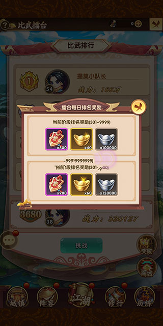 只要点击挑战即可开始选择将要挑战的玩家,小编建议选择低于我方战斗力的对手,如果战胜名次较我方高的对手,则双方排名互换,反之则排名保持不变。挑战成功还能额外获得荣誉点,失败则只能获得少量银币奖励。