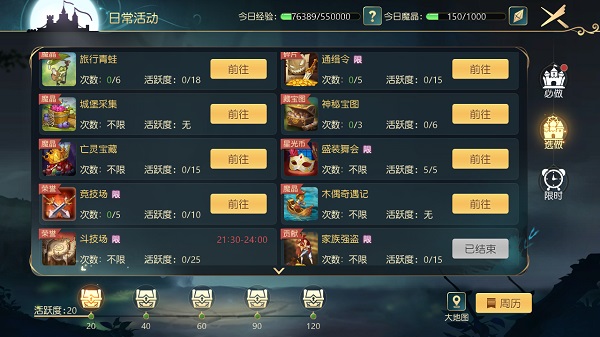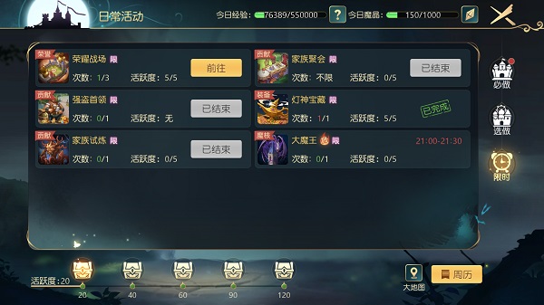 大多数玩法在参与以及完成的同时,会给予当天的冒险者本身的活跃度,活跃度进度条可在活动界面下方看到。