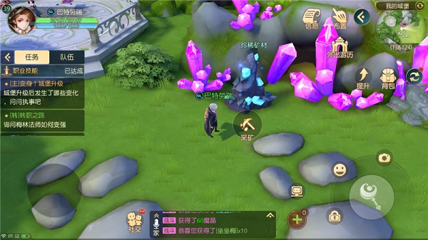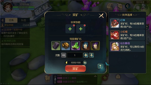 每次采矿可得矿物1个,而所得的矿物是随机的;随着城堡的升级,可得的矿物也会随着解锁增多,伙伴协助也可以有概率获得多倍收获