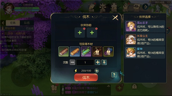 伐木与采矿类似,每一次伐木需要消耗100体力,而通过伙伴协助,可以降低活力消耗