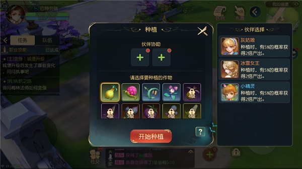 种植不消耗活力值,种子随着城堡的升级而解锁;作物的成熟需要等待一定的生长时间,不同作物的成熟时间也不一样哦,靠近作物会提示当前作物的成熟倒计时