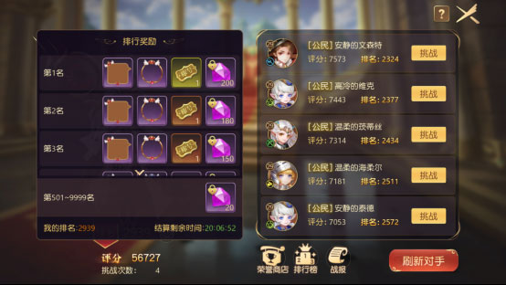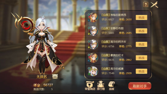 竞技场是勇者们互相切磋的圣地,也是每位冒险者个人实力的直观体现,勇敢的去挑战排行榜上的冒险者吧,争取更高的个人名次。竞技场是采用排名互换机制,即低排名玩家挑战高排名玩家并获胜,即可互换彼此排名。