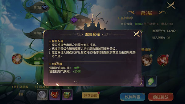 冒险者也可以注意下面板的推荐评分,当然如果对自己手操有信心,可以越过推荐评分进行挑战的。而且为了鼓励冒险者挑战自我,魔藤之塔还有专属的魔豆祝福,可以降低伙伴觉醒技冷却时间以及增加玩家获取合体技所需要的怒气值,从而帮助玩家更好的挑战魔藤之塔。