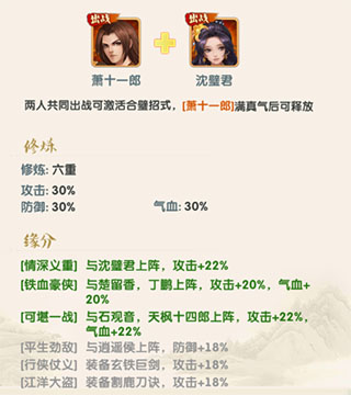 最后,按照可上阵人物等级,2级第2阵位,3级第3阵容,11级第4阵位,16级第5阵位,23级第6阵位。最终可凑成掌门+2对合璧弟子+1个弟子的阵容。搭配侠缘阵,可以将弟子缘分激活达到最大的属性加成。