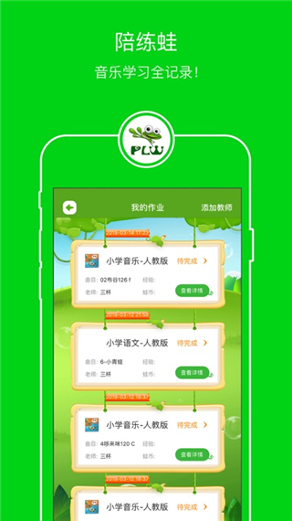 4、陪练:全方位帮助孩子在家练习,包含全曲示范视频、有趣的背景音乐、多种练习步骤、智能纠错功能
