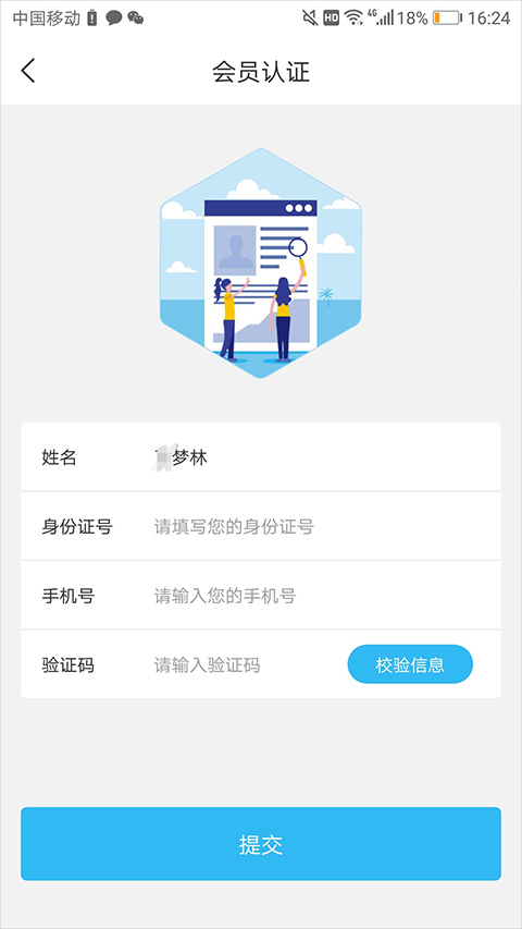2、在打开的认证页面中,依次输入姓名、身份证号、手机号,以及输入通过点击【校验信息】获取到的验证码,输入上述信息后点击【提交】