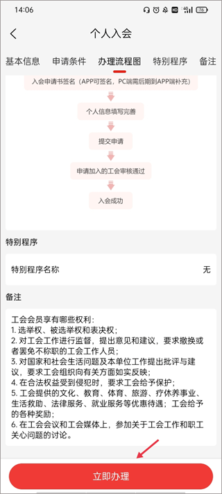 2、了解入会的相关流程和申请条件等信息之后,点击下方按钮“立即办理”。