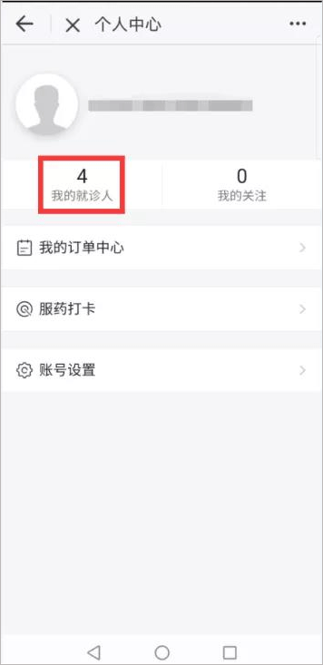 3、 进入手机APP挂号主界面,点击右下角头像图标,进入个人中心页面,点击“我的就诊人” 按钮,进入就诊人列表界面,点击下方“添加就诊人”按钮。