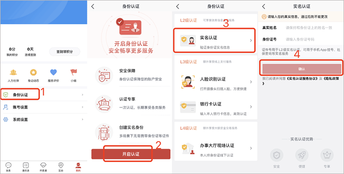 1、实名认证进入方式:主界面右下角“我的”,选择“身份认证”,点击“开启认证”,进入实名认证页面,按页面提示输入姓名和身份证号码,点击“确认”,认证通过后提示认证成功,完成实名认证。