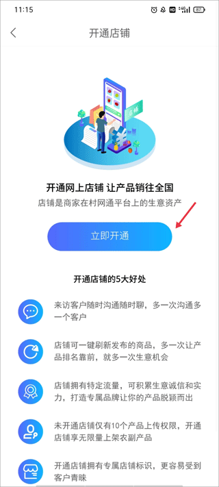 3、页面上会介绍开通店铺的五大好处,了解了之后就可以继续点击“立即开通”。