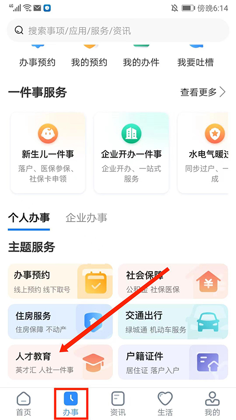 1、打开郑好办app,在【办事】界面,选择左下方【人才教育】选项,