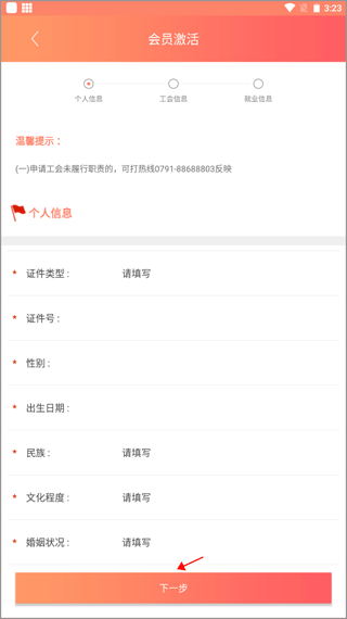 3、填写你要申请加入的工会信息,将工会信息输入正确后再次点击下一步。