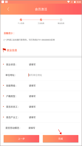 4、最一步是填写自己的就业信息,根据就业状态等填写完,再点击下方的“完成”,等待系统审核通过就可以加入工会了。