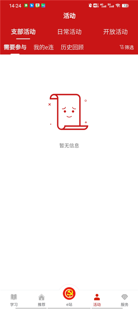 4、活动中里面为用户提供了支部活动、日常活动、开发活动等等活动,还拥有需参与的活动、我的e连和历史回顾等等功能;