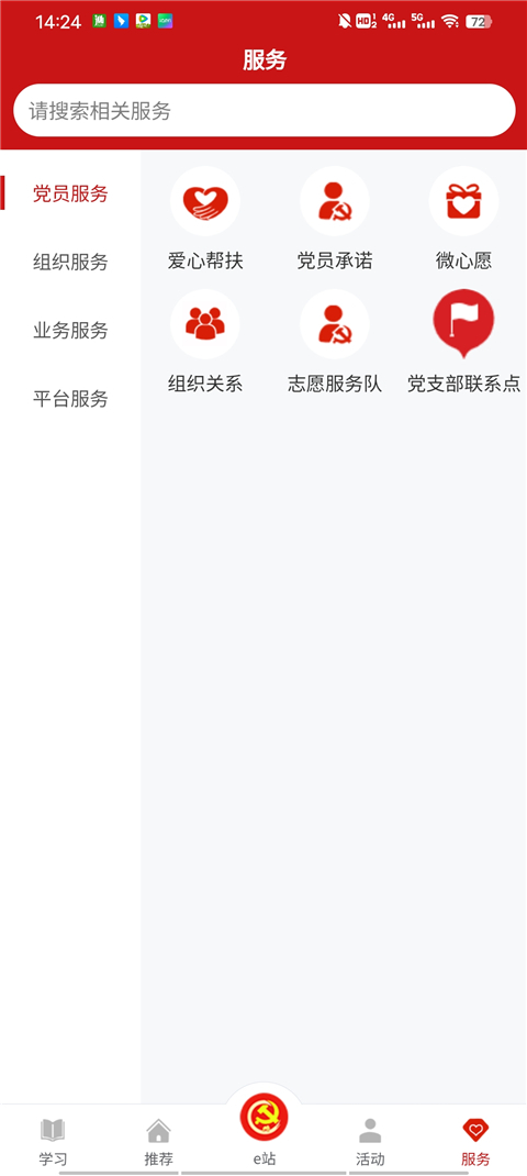 5、最后在服务栏目中,里面为用户提供了党员服务、组织服务、业务服务、平台服务等等四大服务功能。