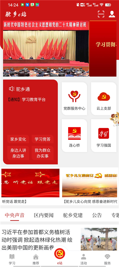 3、在e站中他为用户提供了通知、党群服务、云上支部、连心桥、学习强国等功能,还拥有最新的党建新闻;