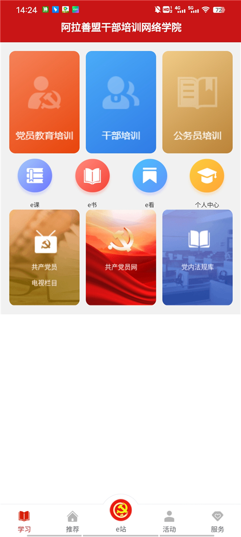 1、进入应用首页,点击学校,里面为用户提供了党员教育培训、干部培训、公务员培训、e课、e苏、e看、个人中心、共产党员电视栏目、共产党员网、党内法规库等功能;