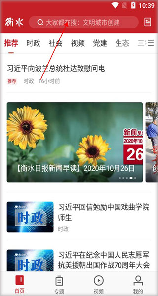 1、下载app,安装软件,打开软件进入首界面,用户可以在搜索框搜索您想要看的新闻;