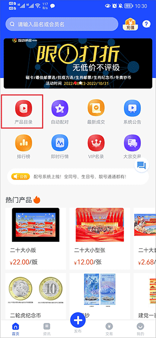 1、打开邮币卡互动网app,在首页中点击产品目录