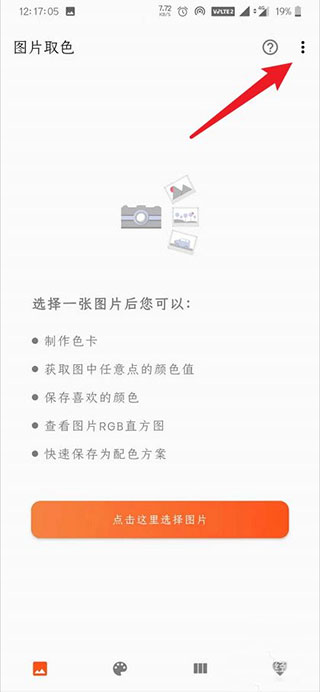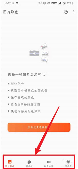 图片取色直接列出图片中的主要颜色供您挑选,也可以单独获取任意点颜色,还可以生成分享色卡;