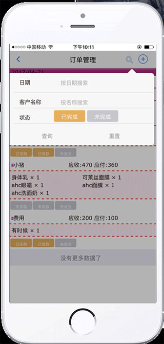 1、查询已完成的订单,在订单管理里面按右上角查询按钮,选择状态已完成,再按查询即可以查询已完成的订单(已完成的订单是指,已采购,已收款,已发货的订单)。