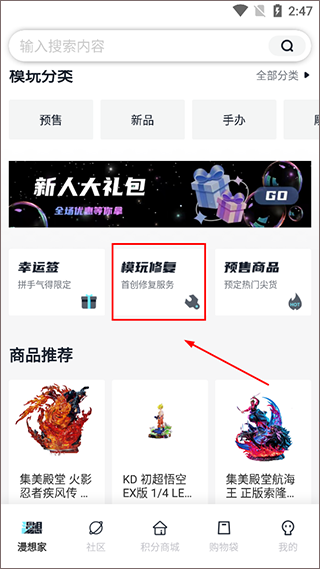 1、打开登录漫想家app,点击首页的【模玩修复】