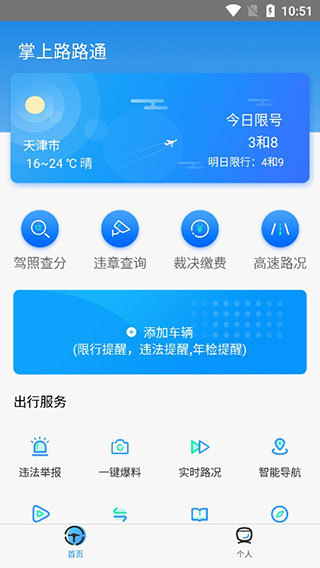 掌上路路通app是由逸兴泰辰(天津)科技有限公司打造的一款综合性出行软件,为用户带来了众多天津本地的出行信息,拥有驾照查分、违章查询、裁决缴费、高速路况等功能,车主朋友使用它能够了解到自己有没有违章,如果违章了还能缴费罚款,当你在高速上行驶的时候,也可以了解到详细的高速路况信息,以便提前做好出行规划。此外该软件还提供了扫描挪车、预约验车、违法举报、车辆评估等车主服务,而且你还能通过一键爆料功能向挥中心报告路面情况,帮助其他车主更好的出行。