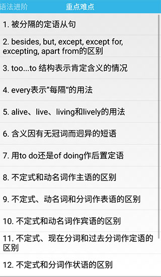 grammar app 是一款非常棒的英语语法学习软件,它汇集了丰富的语法知识,并通过详细的讲解和分类帮助用户更好地理解和掌握。软件里不仅有基础语法,还有进阶内容,比如定语从句、名词性从句等复杂知识点。特别喜欢它的在线课程和答疑功能,遇到难题可以直接解决,省去了很多查资料的时间。此外,软件的结构非常清晰,所有内容都分门别类,方便查找和学习。特别是它还配有详细的解析和实例,让语法学习不再枯燥无味。对于我这种英语基础不太扎实的人来说,这款app真的是个大救星!总之, grammar app 是一款非常实用的学习工具,值得推荐给需要提升英语语法能力的朋友。