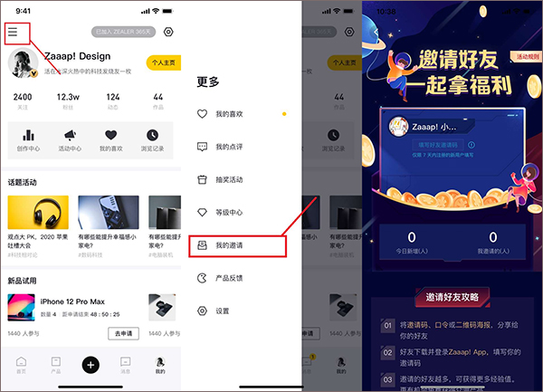 (1)好友邀请如何填写邀请码?点击【我的】个人中心主页左上角更多菜单,可以查看【我的喜欢】、【我的点评】、【抽奖活动】、【等级中心】、【我的邀请】等功能页面。其中【我的邀请】可以填写活动的邀请码,邀请好友越多,获得试用产品的几率越大。