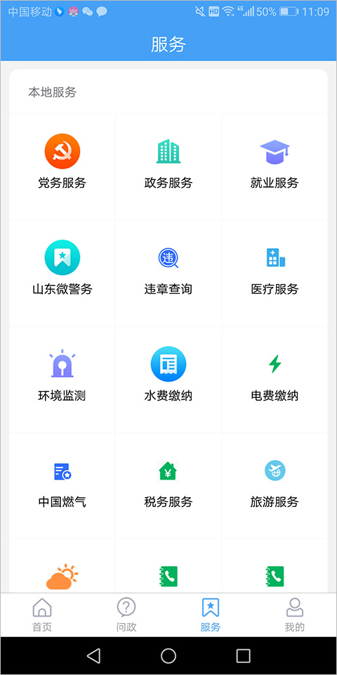 3、【服务】页面上给用户提供了就业服务、水费电费缴纳、医疗服务等,以及申请法律服务,企业招聘、车票预订、公交查询、话费充值等第三方服务