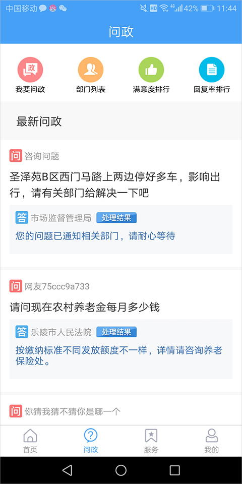 2、【问政】页面中用户可以看到日常群众向政府建议或投诉的事件,用户自己也可通过【我要问政】向政府进行反映问题