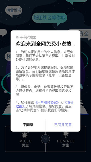 1、下载安装本站提供的全网免费小说搜索app,第一次进入软件需要同意用户协议;