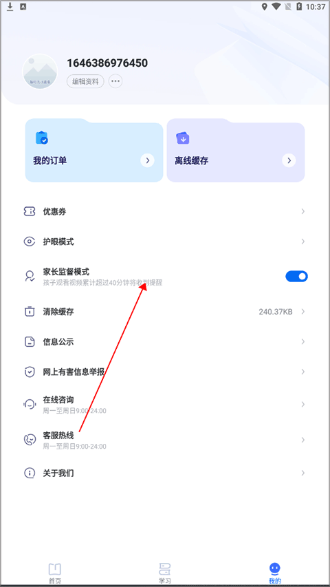 2、在我的栏可以设置家长监督模式,当孩子观看视频累计超过40分钟将收到提醒。