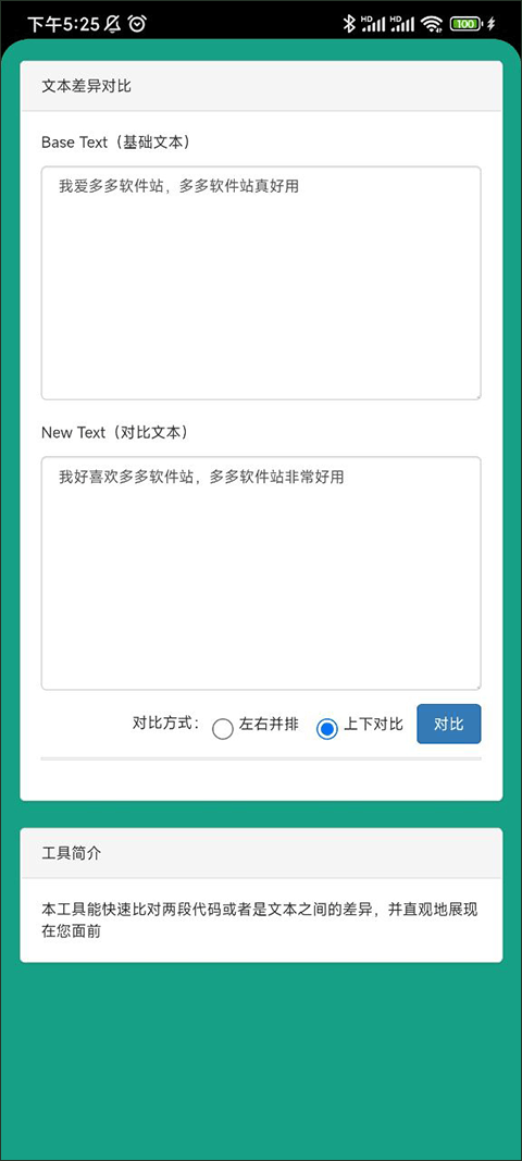 3、将需要对比的文本分别粘贴在2个输入框中然后点击对比就完成了。