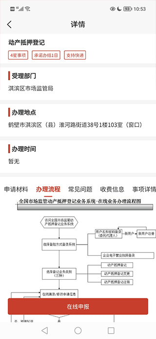 3、按照页面提示操作,看清申请材料、办理流程、收费等信息后找到并点击“在线申报”按键,即可开始申请了。
