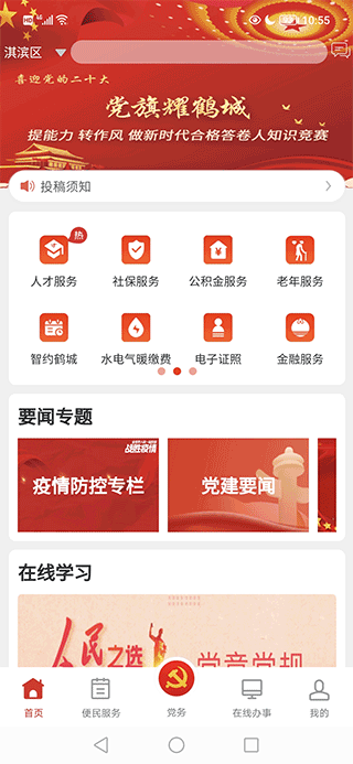 党政服务平台app是鹤壁市政务服务和大数据管理局开发的一款非常实用的党政服务软件,又称之为鹤壁市党政服务平台app,用户可以在首页查看到核酸检测的各种信息;在便民服务中用户可以在这里使用到交管服务、公积金服务、本地服务、疫情方面的服务;在党务方面,用户可以在这里查看党建要闻、党建动态、部门动态等消息;另外在“在线办事”一栏,用户可以在这里进行个人或法人办事,在“我的”当中用户可以在这里查看到自己的信息和对系统的设置,这么好的一款软件,大家有需要就快来下载吧!