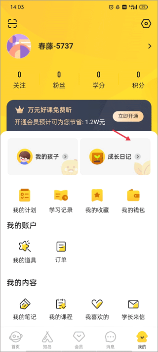 1、选择“我的”个人界面右边的“成长日记”并点击进去。